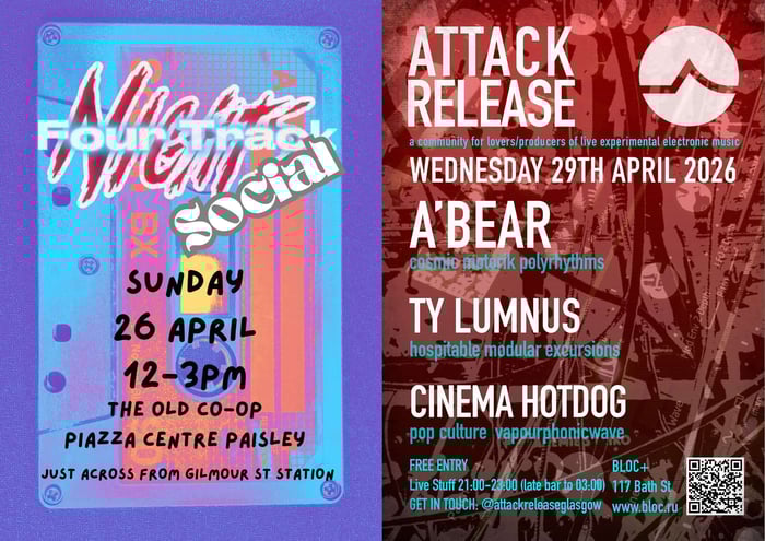 A couple of great local events are coming up at the end of the month. The Four Track Nights Social on the 26th is the start of a semi-regular meet-up for electronica enthusiasts in Paisley. Whether you make noise, techno, experimental loops or ambient, come along and meet people who share your passion for music, synths, tape and all things experimental. There will be tea, coffee, snacks and synth nerd chat aplenty! The following Wednesday, Attack Release is back at Bloc in Glasgow with A'Bear, Ty Lumnus and the wonderfully-named Cinema Hotdog delivering live performances. See you at the bar?